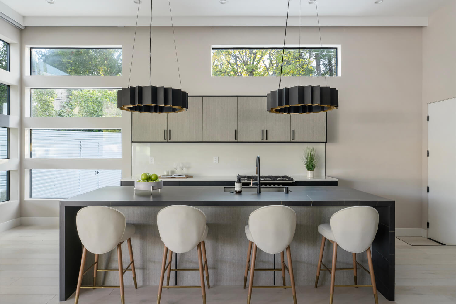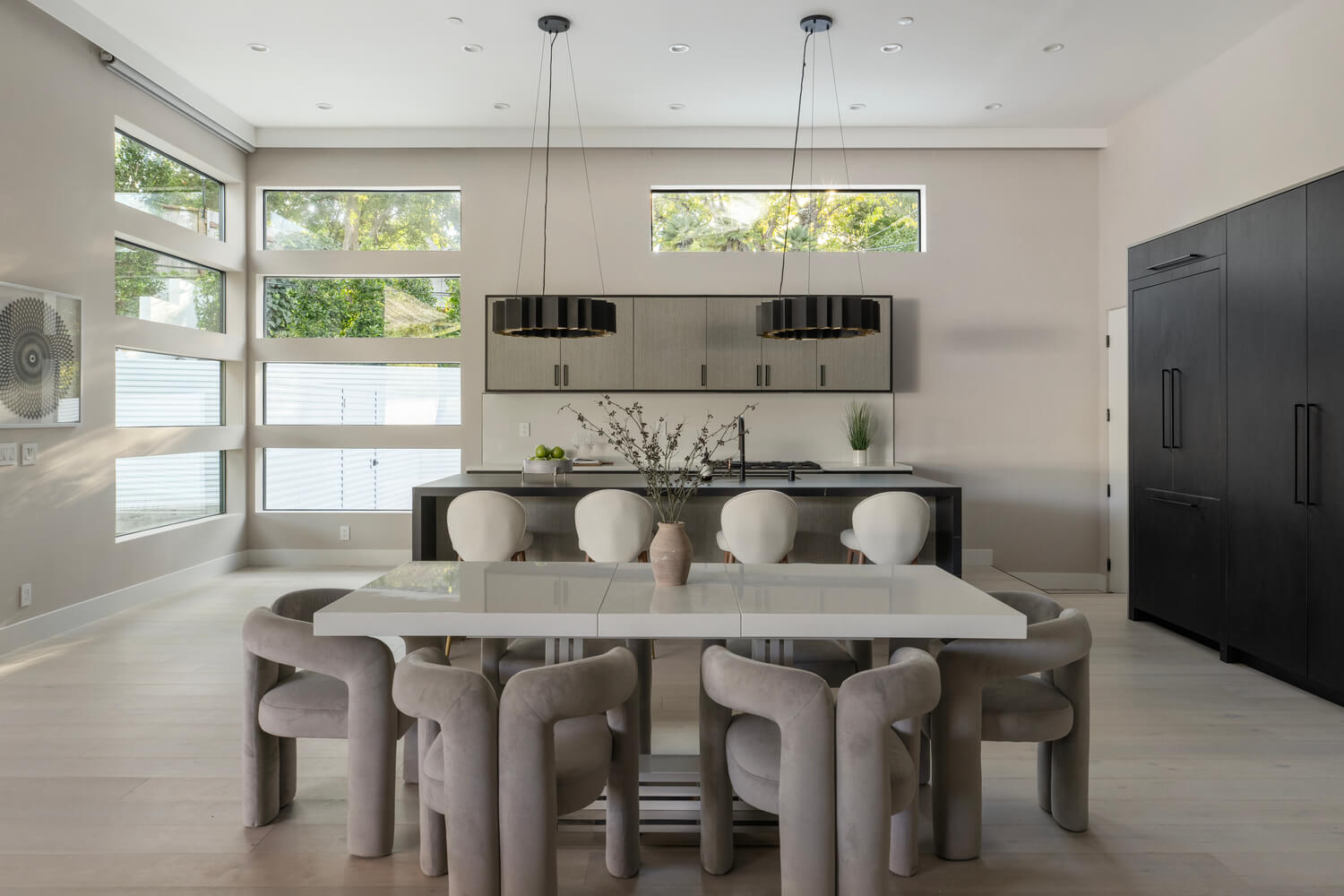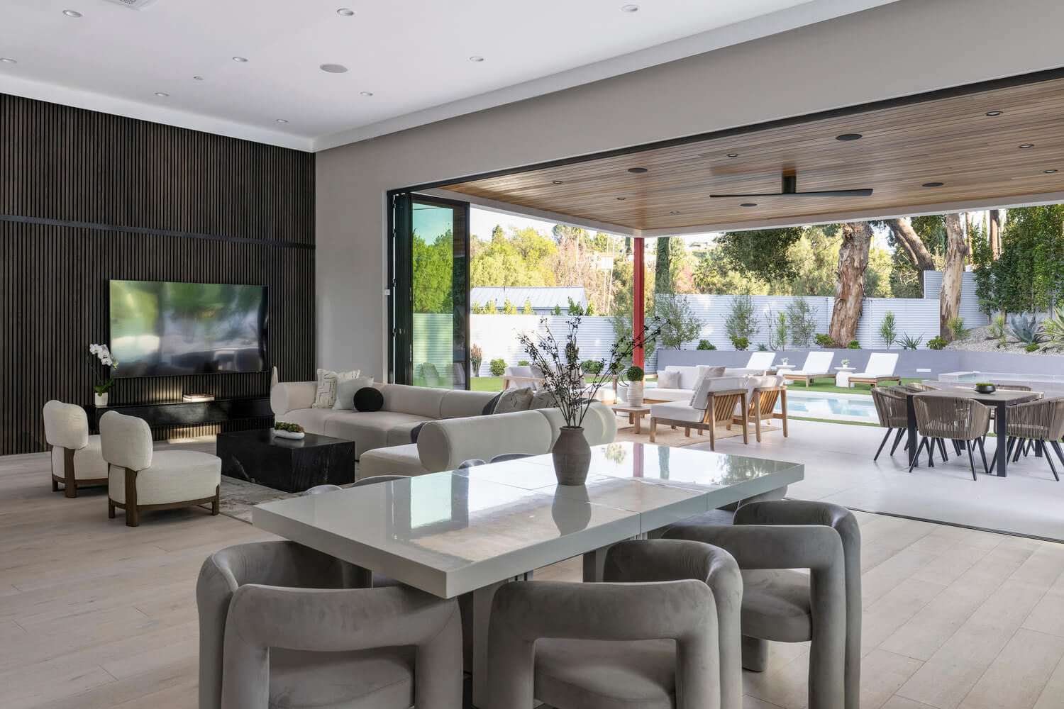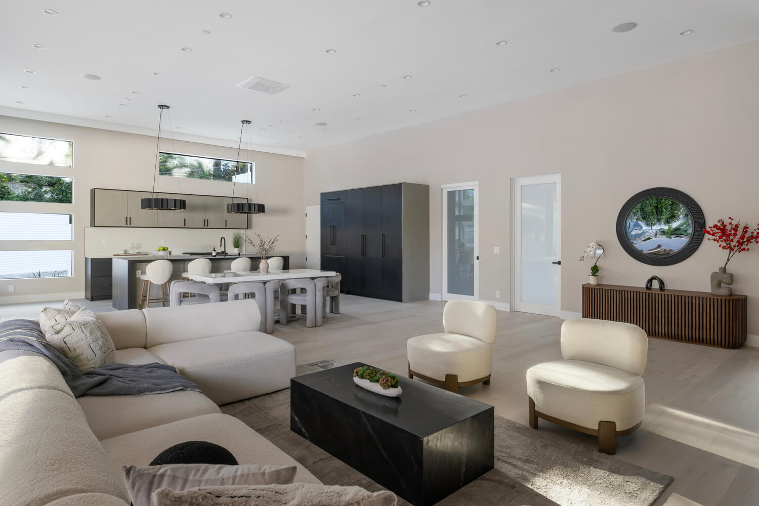 Soaring 13-foot ceilings create an airy, expansive atmosphere throughout, while the seamless indoor-outdoor design blurs the line between interior comfort and alfresco living. The custom kitchen features built-in appliances and flows effortlessly into the entertaining spaces, making it ideal for hosting.