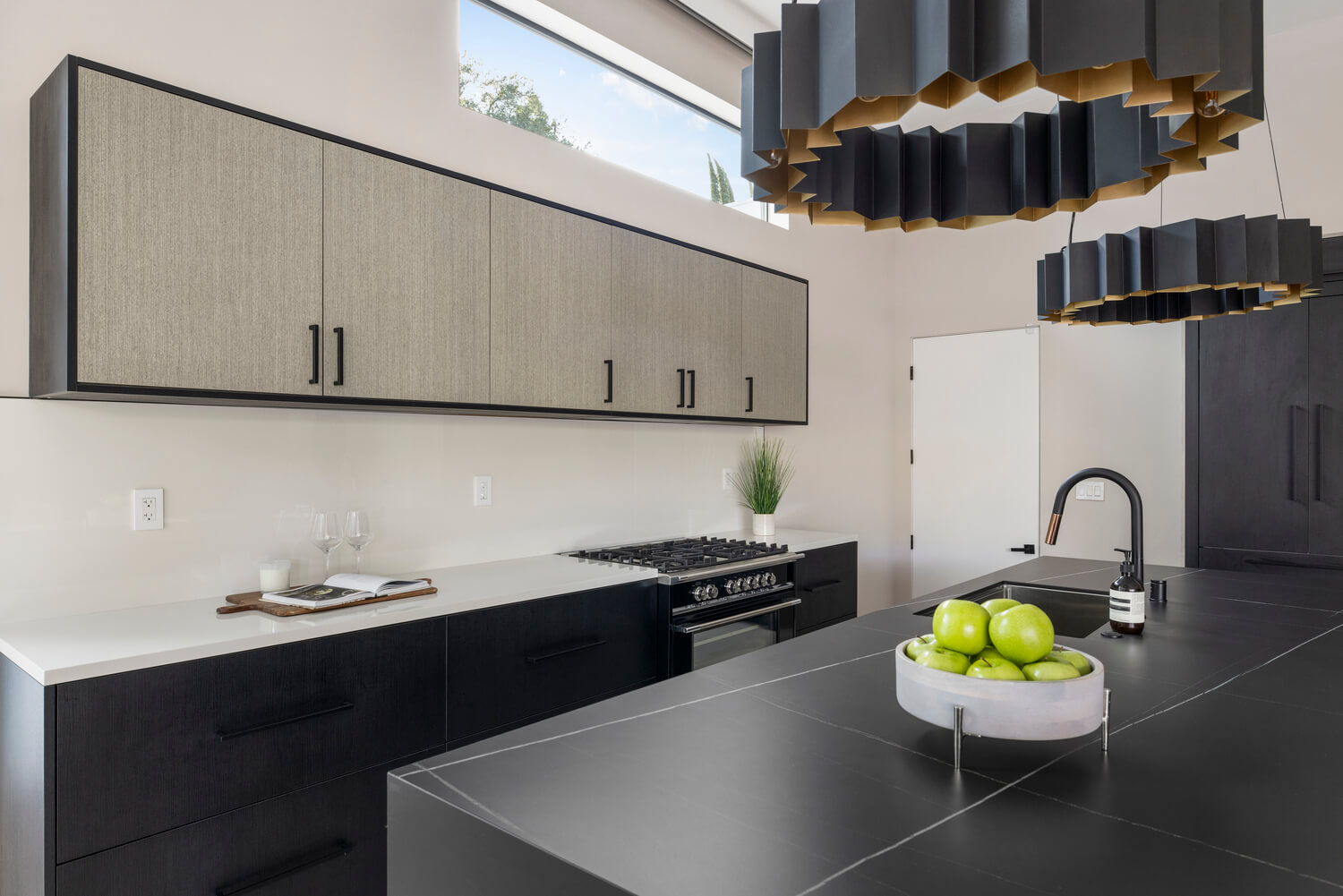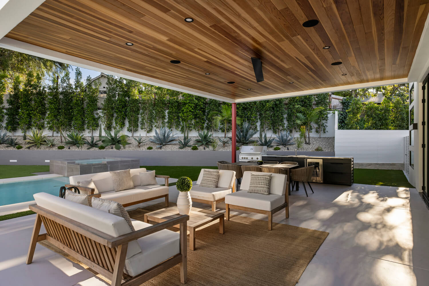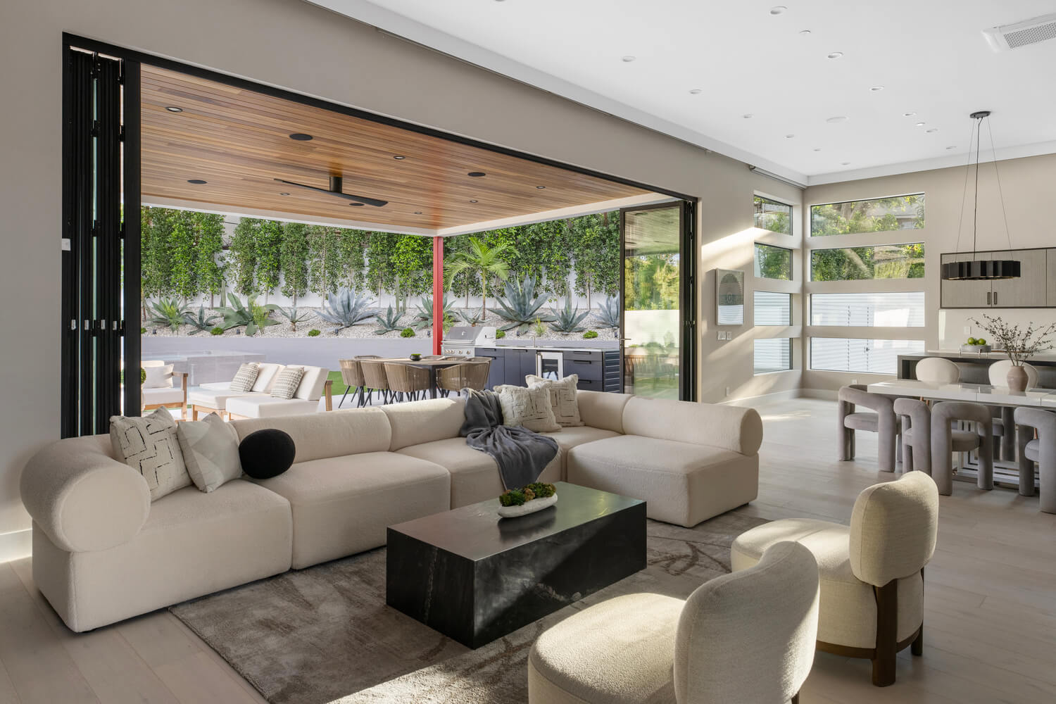 Soaring 13-foot ceilings create an airy, expansive atmosphere throughout, while the seamless indoor-outdoor design blurs the line between interior comfort and alfresco living. The custom kitchen features built-in appliances and flows effortlessly into the entertaining spaces, making it ideal for hosting.